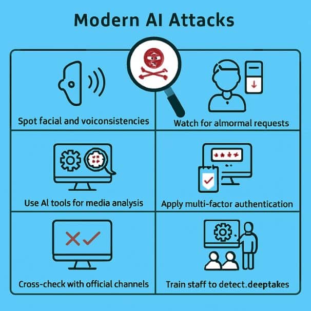 - Multi-Modal Attacks: These combine voice, video, and text simultaneously—one deepfake voice call backed up by a “confirmation” email and a video message. Traditional verification breaks down because the attack targets multiple channels simultaneously.